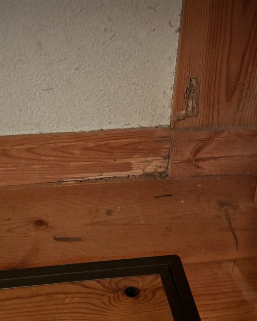 シロアリ出現のご相談です。浴室かとトイレかと思いましたが、まさかのリビング。初めての経験です。結構食ってますね。