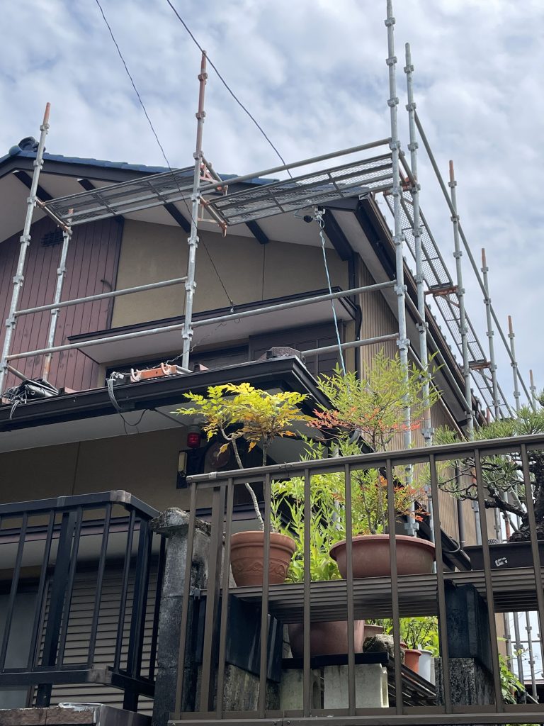 屋根工場の仮設足場を設置してます。ちょっと狭いのでいろいろと大変です。屋根工事は水曜日からの予定です。