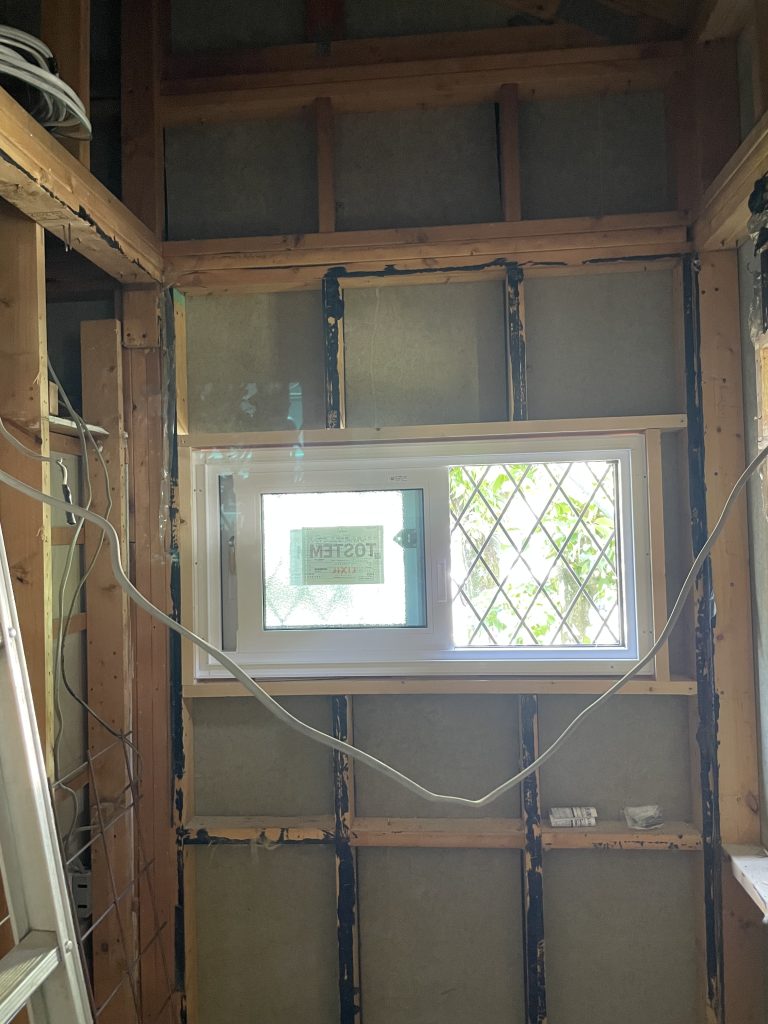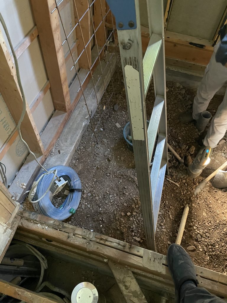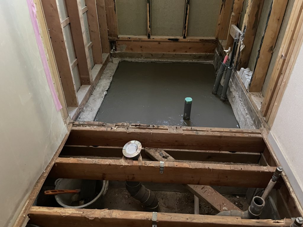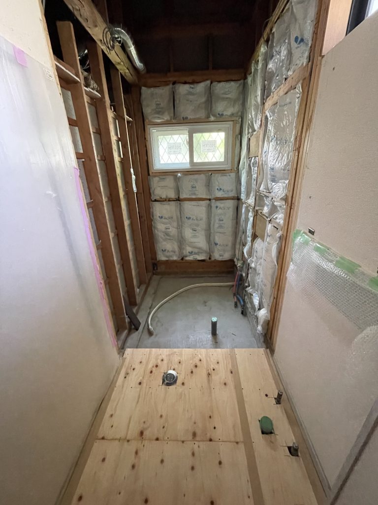 解体工事から土間コンクリート工事まで。脱衣室も下地合板貼っています。