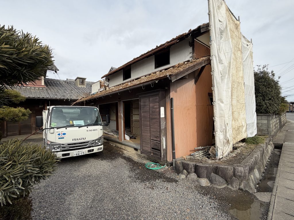 解体工事始まりました。足場を架けて、瓦から降ろします。